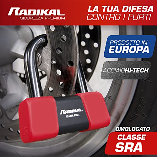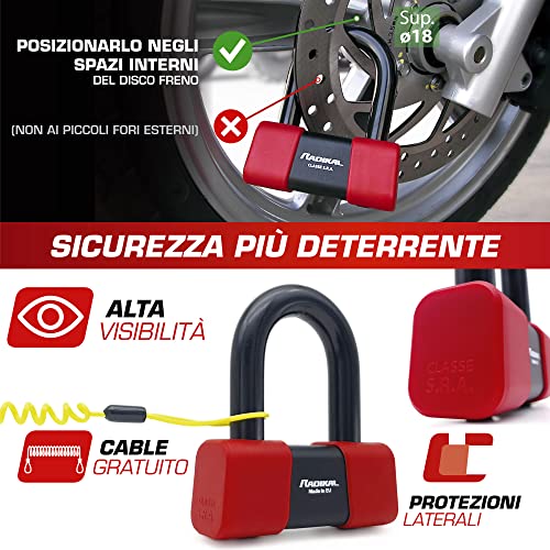 RADIKAL RK75 Bloccadisco Moto Mini U Omologato, Testato in Laboratorio, Forcella in Acciaio Hi-Tech 18mm, Doppia Chiusura, SEK DISCTECH, Multiuso Cavo Promemoria, Lucchetto Antifurto Moto Disco