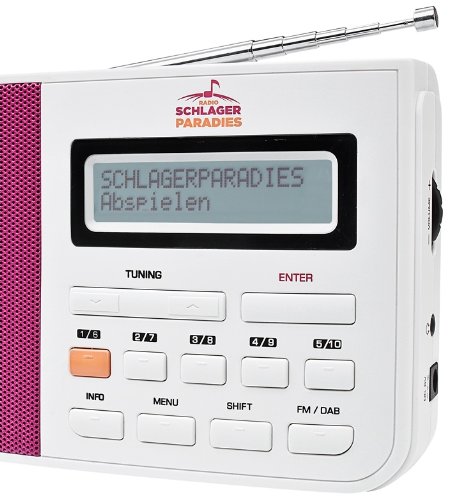 Radio digitale con tasto memorizzazione, tuner DAB+/UKW, tasto Schlagerparadies, funzione ricerca programmi, display LCD, collegamento auricolari da 3,5 mm, ora, indicazioen data, bianco