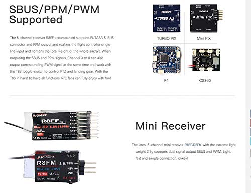 Support Multiple Models and Receivers: Compatible with fixed-wings, gliders, multicopters, RC cars and boats. T8S can use with R6FG,R6F, R7FG, R8EF, R8FM mini receiver. In this package comes along with double receivers, R8FM & R8EF.