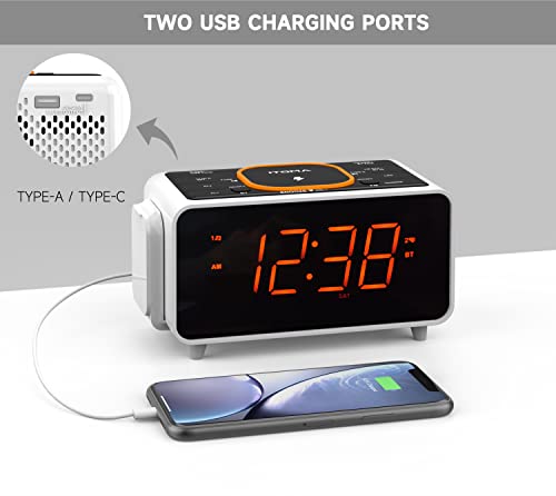 Radiosveglia, Caricabatterie Wireless Bluetooth 15 Watt, Porta USB, Doppia Sveglia Dock di Ricarica, Snooze, Sveglia Digitale Dimmerabile, Display da 1,4 Pollici Luce Notturna LED Arancio iTOMA CKS209