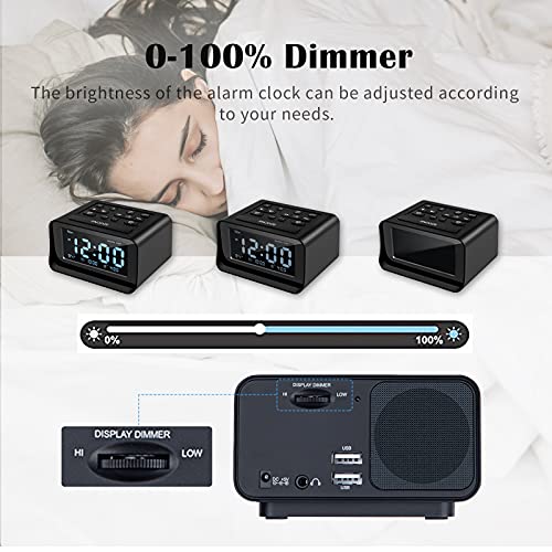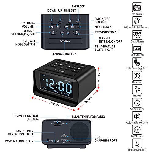Radiosveglia con Doppio Allarme, Sveglia Digitale da Comodino con 2 Porte di Ricarica USB, Dimmerabile 0-100%, Timer di Spegnimento Radio FM, 6 Suonerie, Termometro Interno, Funzione Snooze (Nero)
