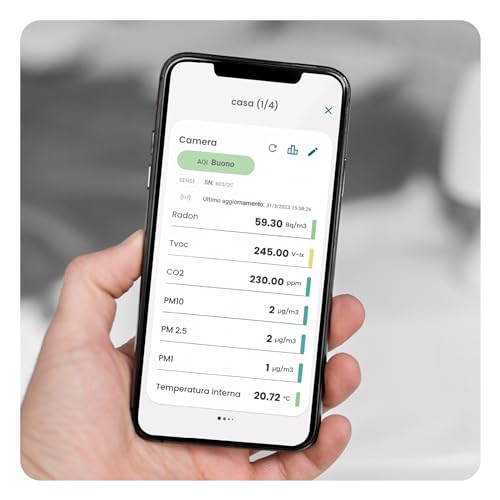SENSORE QUALITÀ ARIA E RILEVATORE RADON: Radoff Sense è un radon rilevatore, misuratore polveri sottili, anidride carbonica, composti organici, sensore temperatura smart, sensore umidità e pressione atmosferica all'interno dei tuoi spazi abitativi. Crea un ambiente sano. Respira bene, vivi meglio
