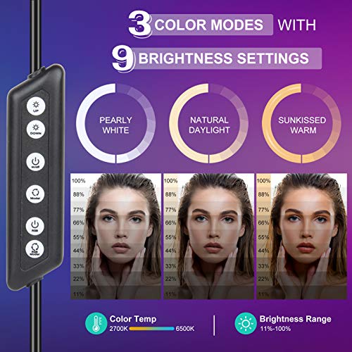 21 Colori RGB & 3 Colori Normali-- Dotato di 168 LED, per rendere l'angolo di ripresa più chiaro e luminoso. Bianco/bianco caldo/giallo caldo, verde, blu, viola, arancione, giallo, rosa, modalità di respirazione & lampeggio e ogni modalità ha 9 livelli di luminosità, 24 opzioni in totale con un range di dimmerazione di 10% -100%. Temperatura di colore 2700K-6500K, senza UV, senza sfarfallio, senza ghosting, senza abbagliamento. Può soddisfare tutte le tue esigenze in diverse circostanze.