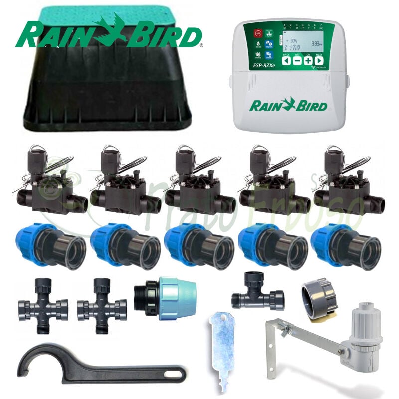 Kit completo per la realizzazione di impianto di irrigazioni a 5 stazioni. Il kit contiene tutto il necessario, a parte gli irrigatori e le tubazioni, per irrigare automaticamente 5 settori di irrigazione con componentistica primaria Rain Bird. Basterà assemblare i vari componenti per realizzare un impianto a automatizzato efficiente e funzionale. Centralina, elettrovalvole e sensore pioggia Rain Bird. Contenuto della confezione: n. 1 Centralina Programmatore irrigazione Rain Bird stazioni modello RZX6ei n. 1 Sensore pioggia Rain Bird RSD-BEX n. 1 Collettore per elettrovalvole a 2 uscite da 1" n. 1 Collettore per elettrovalvole a 3 uscite da 1" n. 5 Elettrovalvole Rain Bird 100-HV 24V da 1" femmina n. 1 Pozzetto rettangolare maxi serie Lite n. 5 Raccordi a compressione maschio da 1" x 25 n. 5 Nipplo da 1" n. 1 Tappo filettato femmina