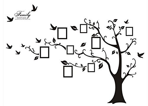 Rainbow Fox, grande cornice nera adesiva da parete, Art Wall, a forma di albero con rami ed uccellini, 8 cornici portafoto incluse, frase adesiva sulla famiglia, misura 180 x 250 cm, colore nero;