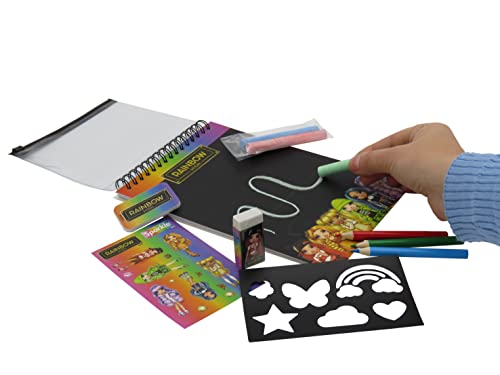 COMPRENDE: un quaderno in ardesia e un astuccio trasparente con chiusura a zip contenente 3 matite piccole, 1 stencil, 1 foglio di adesivi, 1 gomma, 3 gessetti e 1 temperamatite.