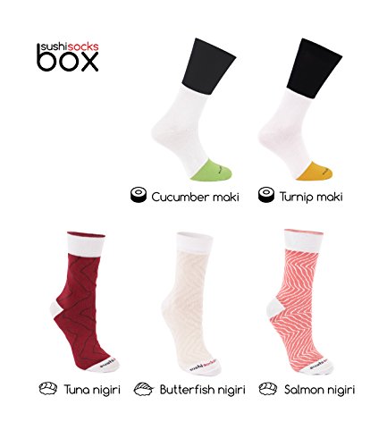 CALZINI UNICI E STRAORDINARI -- I sushi socks sono gli unici in tutto il mondo. L'idea per i calzini che sembrano e che sono pacchieggiati come i sushi veri è stata nata parecchi anni fa nei testi dei giovani creativi che amano i sushi. Ogni calzino viene deposito in modo appropriato cosi come sembra questa delicatezza giapponesa. Se cerchi degli unici calzini, questi per te. I fan di sushi di calzini comici uniamoci!