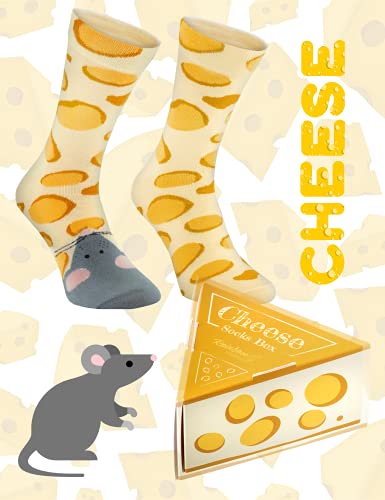 1. Calzini motivo formaggio per uomo e donna - calzini lunghi unisex con il motivo formaggio giallo con fori. Disponibili in due versioni, con o senza la stampa di un topo, chiuse in una scatola triangolare. Ideali da indossare tutti i giorni, o come regalo per una persona che ama i taglieri di formaggi. Le calze sono disponibili in tre combinazioni: formaggio-formaggio, formaggio-topo, topo-topo. Taglie EU 36-40 / US 5.5-9, EU 41-46 / US 9.5-13 o EU 47-50 / US 13.5- 15.