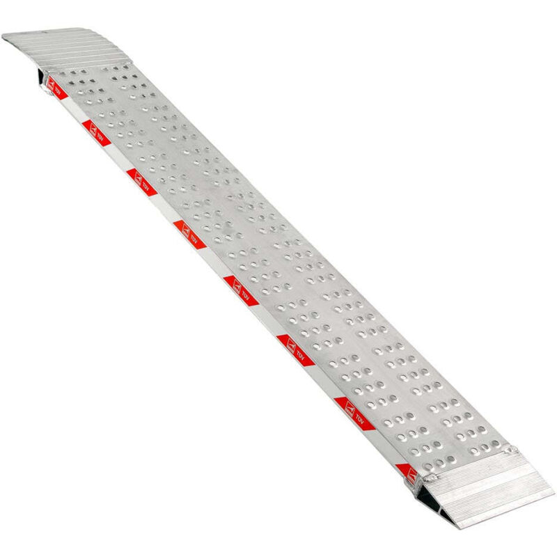RAMPA IN ALLUMINIO FISSA LUNGHEZZA CM.200 Rampe di carico in alluminio estruso ad alta resistenza, rinforzata con nervature, supperficie con lavorazione a bugnatura antiscivolo, testa della rampa con foro centale per l'ancoraggio al veicolo, coda con profilo triangolare per mantenere l'inclinazione più idonea nell'appoggio a terra. La portata garantita varia con l'utilizzodi una o due rampe e seconda la concentrazione del carico, su uno, due o tre punti di appoggio. • cm. 200: Portata Kg.: Peso unico concentrato Kg. 110 Peso distribuito a Passo mm. 500/750/1000 = Portata Kg. 148/188/243