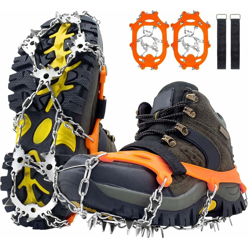 Ramponi aggiornati: le nostre nuove tacchette per la trazione sul ghiaccio sono dotate di 19 punte in acciaio inossidabile di alta qualità e un solido sistema di catene, l'equilibrio migliorato per l'antiscivolo, per assicurarti un viaggio sicuro anche nelle peggiori condizioni. Più leggero e più comodo: i nostri chiodi aiutano a fornire una migliore trazione sui ghiacciati sentieri invernali. Resistenza alle alte temperature da -50°C a 220°C. Non si strappa o si rompe e facile da indossare e da togliere con il cinturino regolabile, garantisce comfort e durata di lunga durata. Unisex e ampiamente utilizzati: i tacchetti si adattano a una varietà di calzature come scarponi da trekking, alpinismo e doposci, scarpe da trail running, ecc. Buono per uomini e donne di tutte le età, compresi adolescenti, adulti e anziani. E può essere utilizzato su terreni in pendenza, strade ghiacciate, vialetti ghiacciati, fango ed erba bagnata, tratti pericolosi di sentiero, ecc. Ottimo accompagnamento