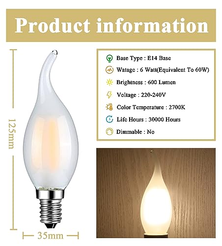 RANBOO Lampadine LED E14 a Filamento 6W Equivalenti 60W, Luce Bianca Calda 2700K, 600 Lumen, Lampadine LED Candela per Lampadario, Non Dimmerabile, Vetro Smerigliato, Pacco da 10
