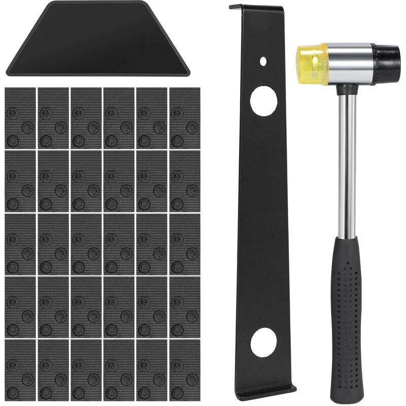 1.Un set di attrezzi completo: 1 gancio di recupero, 1 battente in plastica, 1 martello di installazione (27,5 cm), 30 distanziatori. 2.Ora potete installare rapidamente il vostro nuovo pavimento in laminato o in legno con questo set di attrezzi professionali e di facile applicazione. 3.Il martello a doppia faccia ha un'impugnatura in gomma antiscivolo che assorbe le vibrazioni. La testa del martello rimovibile è realizzata in gomma piena su entrambi i lati per una maggiore resistenza e durata. Questo permette un controllo preciso della forza applicata. della forza applicata. 4.Il blocco del martello e i cuscinetti sono realizzati in plastica PP ecologica e sono inodore, sicuri e durevoli. 5.Che siate principianti o professionisti, questo set di 30 distanziatori per pavimenti in laminato vi permetterà di installare pavimenti di spessore compreso tra 7 e 15 mm in modo rapido, efficiente e preciso. Specifiche Colore: nero Dimensioni del martello: 27,5 cm x 7,5 cm Dimensione del gancio