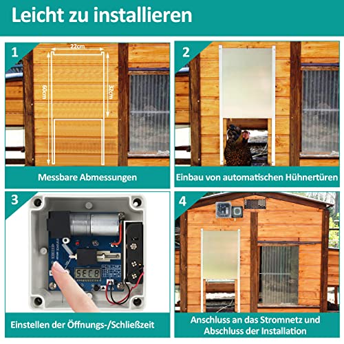Porta durevole: il portello automatico per polli non richiede cablaggio ed è alimentato da 4 batterie AA (batterie non incluse). Il cancello per polli da 32 x 22 cm (lunghezza x altezza) è ideale per fattorie, pollai all'aperto ed è adatto per polli, conigli, anatre, gabbie per uccelli.
