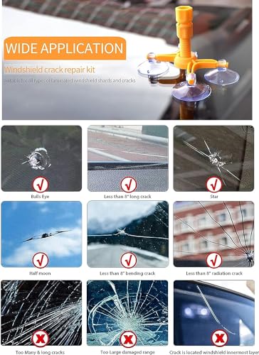 Uso multifunzionale: il kit di riparazione migliorato per parabrezza è adatto per la riparazione di tutti i tipi di parabrezza laminati. Possono essere riparati efficacemente piccoli chip, oblò, ragnatele, mezzaluna a forma di stella, mezzaluna, crepe non più di 20 cm e danni rotondi con un diametro non superiore a un pollice. (Consiglio: non funziona per lo schermo del cellulare)