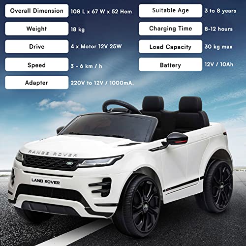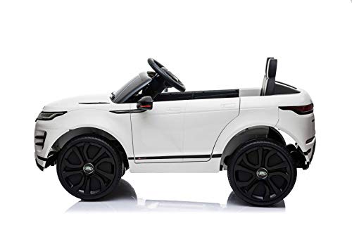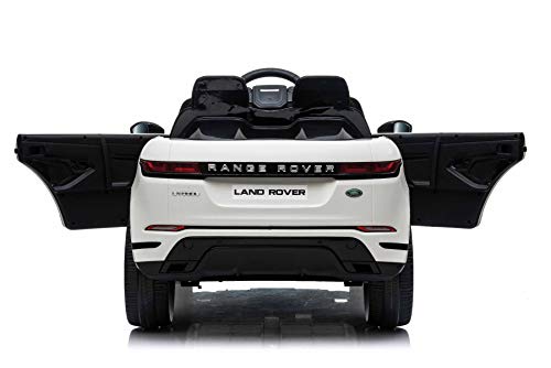 Range Rover elettrico EVOQUE, bianco, doppio sedile in pelle, lettore MP3 con ingresso USB, unità 4x4, batteria 12V10Ah, ruote EVA, avviamento a chiave, telecomando Bluetooth 2.4 GHz, con licenza