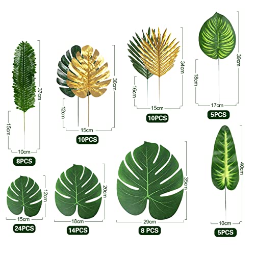 RANJIMA 84PCS Foglie di Palma Artificiali,Piante Tropicali Piante Foglia di Monstera Finta,Foglie della Giungla Dorata con Steli Decorazione per Feste,Hawaiane,Luau,Tema Spiaggia,Matrimonio,Compleanno
