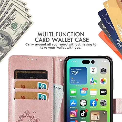 RankOne Custodia in Pelle per HONOR X5 Plus (6.56" Inches), Cover a Portafoglio con 3 Fessure per Carte 1 Tasca Portamonete Motivo Quadrifoglio - Oro rosa