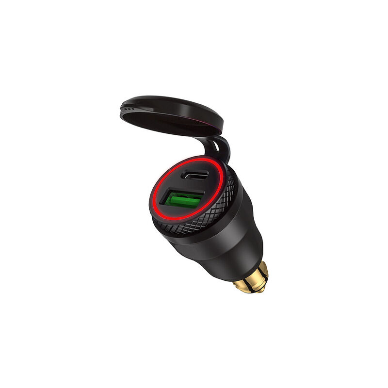 QC. Uscita USB 3.0 solo ricarica rapida per i modelli compatibile con il protocollo Qualcomm QC. Per i modelli non supporta il protocollo, si carica con velocità normale.Uscita 4. 15V/20V solo acgiovives quando l'ingresso è 24V. Specifica:Ingresso: DC 12V-24VUscita USB: DC 4.5V/5A, 5V/4.5A, 9V/3A, 12V/2,5A(max)Uscita di tipo C: DC 5V/3A, 9V/3A, 12V/2.5A, 15V/2A, 20V/1.5A(max)Materiale: AluminimCerchio luminoso a LED: blu/verde/rossoColore del prodotto: nero/rosso/blu/oroDimensioni: 58*28mmPeso: 32gCompatibile per moto 12V-24V con presa accendisigari di piccolo calibro. Ad esempio. Hella/ DIN/BMW