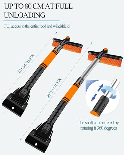 ❄【Lunghezza e Angolo Regolabili】Spazzola ghiaccio L'asta telescopica di tipo a manopola e in metallo ispessito può essere regolata secondo le necessità, la lunghezza può essere regolata da 65 a 80 cm, il blocco è fisso e non scorre a piacimento. Ghiaccio auto premere il pulsante per ruotare la testa della spazzola, la testa della spazzola rotante può ruotare di 360° per eliminare la neve da diverse angolazioni;