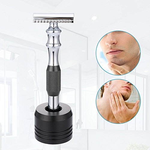 Rasoio da barba classico da uomo con rasoio manuale a doppio taglio in metallo per la cura della barba(Rasoio nero + base)