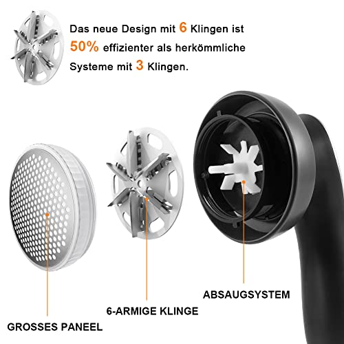 Copertura migliorata della rete a nido d'ape: il rasoio in peluche è dotato di una grande copertura a rete a nido d'ape, che ha un'ampia copertura e può catturare più efficacemente i pelucchi. 6 lame migliorate, più lunghe del 30% e più spesse dello 0,5% rispetto alle lame tradizionali, con un'efficienza di rasatura superiore del 60%. Il nuovo aggiornamento della potenza di aspirazione