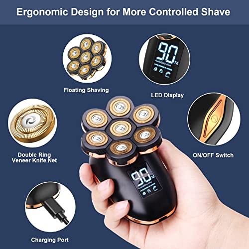 【Testina Rotante Galleggiante 7D】 Il rasoio a testina calva uomo con lame in acciaio di alta qualità, la testa della lama rotante fluttuante precisa e affilata si adatta automaticamente alla testa, al viso, al collo e alla mascella. Il design a 7 lame aggiornato aumenta l'area di rasatura e consente di risparmiare tempo di rasatura e riducendo l'irritazione del cuoio capelluto. Per darti un'esperienza di rasatura efficiente e rilassata.