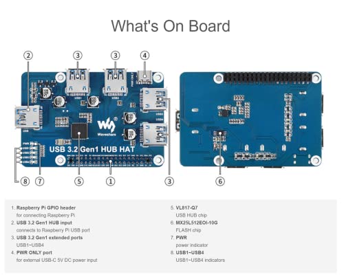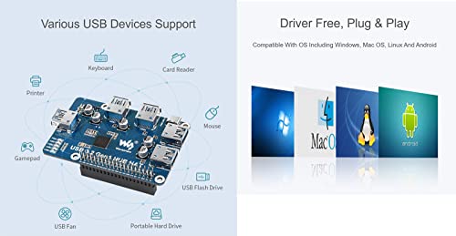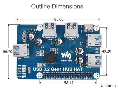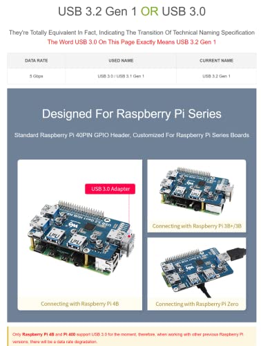 ➤【4 ports USB 3.2 Gen1 HUB HAT for Raspberry Pi】Compatible with Raspberry Pi series boards, when working with Raspberry Pi 4, the USB 3.2 Gen1 ports is able to provide up to 5 Gbps data rate