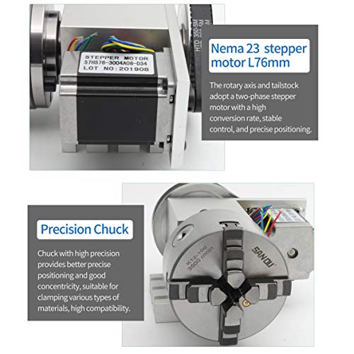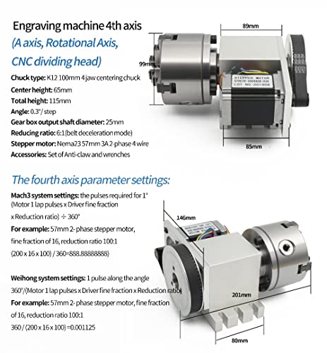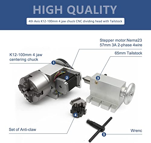 RATTMMOTOR CNC Router Axis 4 assi rotanti K12 - 100 mm, 4 forni da forno Chuck testa parziale con contropunta da 65 mm, asse di rotazione CNC 4th per macchina da incisione fresatrice