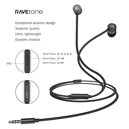 RAVEtone Auricolari in-Ear cablati, HD Stereo Sound Auricolari Sportivi Fit Fit con Microfono Incorporato 3.5mm Jack Control Cable Remote per iPhone iPad Android Samsung Smartphone MP3 / 4 (Nero)