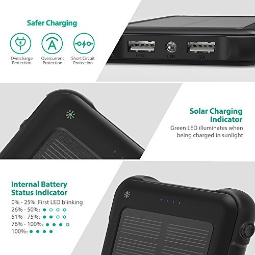 RAVPower Caricabatterie Portatile Solare 10000mAh Powerbank iSmart 2.0, 2 Ingressi(Solare e Presa) Prova di Urto con Mini Torce Luce LED per iPhone Galaxy Android Smartphone Tablet