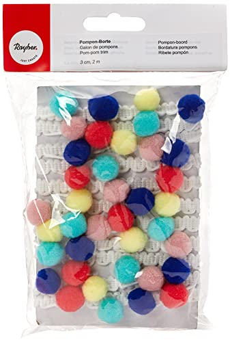 Rayher 55853685 Bordatura con Pompon rotondi colori diversi, dimensione 3cm, lunghezza 2m, passamaneria, per personalizzare vestiti, costumi, borse e per lavori creativi vari
