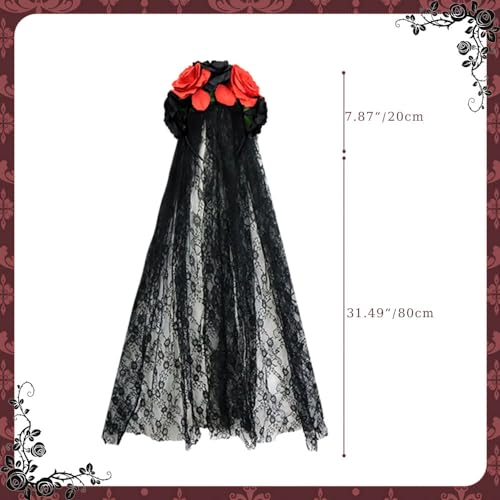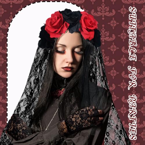Rayson Cerchietto per Capelli di Halloween con Rose Ghirlanda di gotico con Velo Nero per giorno dei morti Fascia Donna Ragazze(Nero+Rosso)