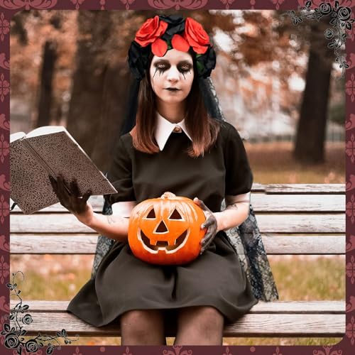 【SCELTA】: gli cerchietto per capelli con rose di Halloween sono disponibili in una varietà di colori di rose tra cui scegliere (nero, rosso, nero+rosso, nero+bianco,nero+giallo), la dimensione della fascia è di 13cm*12cm,velo:100cm*150cm, adatta alla maggior parte delle forme della testa.