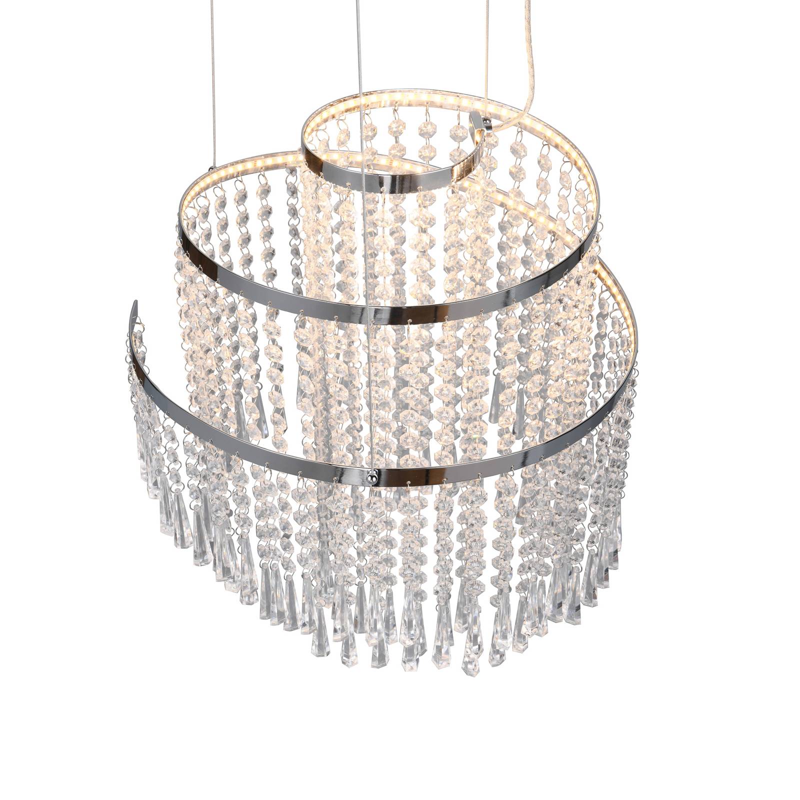 Lampada a sospensione Pomp LED: il cromo lucido incontra la funzionalità CCT Sperimentate il potere trasformativo della luce con la lampada a sospensione Pomp LED, un capolavoro in acrilico e metallo che non solo illumina la stanza, ma modella anche l'atmosfera a seconda delle esigenze. La funzione CCT permette di cambiare il colore della luce da toni caldi a toni freddi con il telecomando in dotazione e di creare così l'atmosfera desiderata, sia per una cena intima in sala da pranzo che per un lavoro concentrato in salotto. La tecnologia LED integrata garantisce un'illuminazione efficiente dal punto di vista energetico che non solo è piacevole per gli occhi, ma anche per la bolletta elettrica a lungo termine. La lampada a sospensione Pomp può essere comodamente controllata con il telecomando in dotazione, senza doversi alzare. La funzione di dimmerazione, già integrata nella lampada, offre un'ulteriore flessibilità per regolare la lu