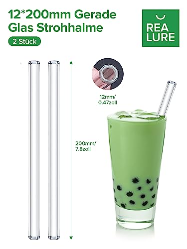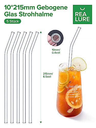Realure Set di 7 Cannucce Vetro Riutilizzabili, Cannucce di Vetro Trasparenti, Cannuccia Vetro da 10 e 12 mm di Larghe, Cannucce in Vetro 21.5cm per Bere, Cocktail, Succhi, Clearwater (Curvo)