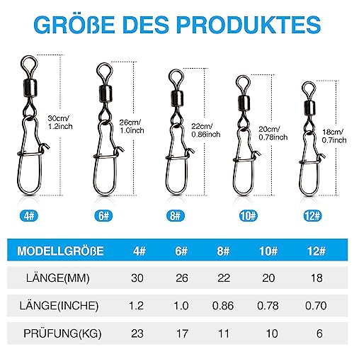 200 girelle da pesca e clip: riceverete 200 girelle da pesca e clip in 5 misure, ben confezionate in una piccola scatola di plastica, 40 pezzi misura 4 (30 mm/1,2 pollici), 40 pezzi misura 6 (26 mm). /1"), 40 pezzi di misura 8 (22 mm/0,86"), 40 pezzi di misura 10 (20 mm/0,78") e 40 pezzi di misura 12 (18 mm/0,7").