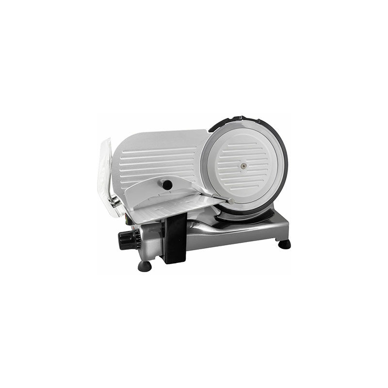 Basamento in alluminio pressofuso verniciato effetto acciaio. Lama professionale in acciaio temperata e rettificata, con anello fisso di protezione. Premisalumi in fusione di alluminio con puntine in acciaio. Paralama, piatto portasalumi e vela in fusione di alluminio con sistema di pulizia facilitata. Albero portalama con doppio cuscinetto a sfere. Motore professionale ventilato. Interruttore di sicurezza. Regolazione spessore taglio da Mm. 0 a Mm. 16. Dimensioni: Cm. 48x35, altezza Cm. 31.