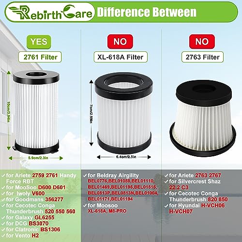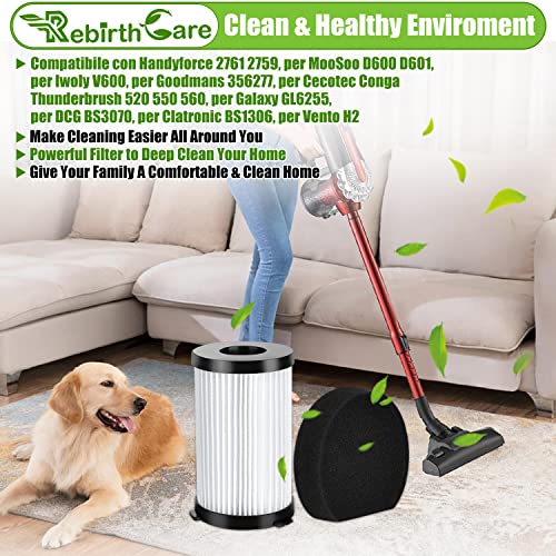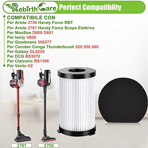 Rebirthcare filtro per Aspirapolvere Ariete Handyforce 2761 2759 Scopa Elettrica Accessori MOOSOO D600 D601 & Iwoly V600 ricambio, 6 filtri Hepa & Spugne
