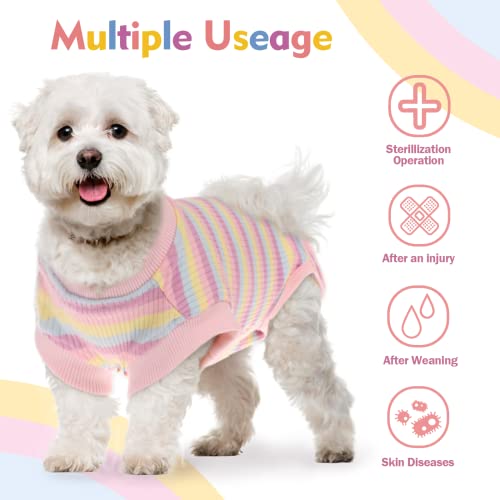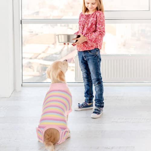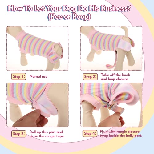 Design unico: il motivo di questa tuta da riposo è a righe colorate, carino e alla moda. I polsini e il colletto sono regolabili per facilitare l'inserimento e la rimozione, e nella zona addominale c'è spazio aggiuntivo per riporre oggetti come un cuscino riscaldante. I vestiti possono essere arrotolati sotto la pancia e fissati con velcro, il che è pratico per il cane per andare alla toilette.