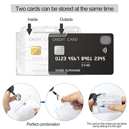 Trasparenti Porta Badge: Dimensioni slot per schede che può contenere carte: 8,5 x 5,5 cm, la pratica fessura per il pollice ti consente di far scorrere la carta dentro e fuori senza sforzo con un solo dito. Il pratico design con caricamento dall'alto mantiene la scheda saldamente in posizione per evitare che cada. ben costruito per la massima trasparenza che ti offre un effetto visivo super chiaro. Facile da leggere o scansionare le tue carte senza rimuovere la custodia della carta.