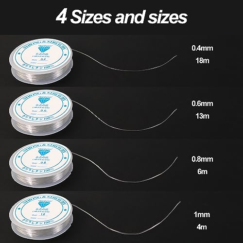 【Set di filo elastico per braccialetti trasparente】Questo set contiene 4 rotoli fili elastici trasparenti in gomma(0,4mm x 18m / 0,6mm x 13m/ 0,8mm x 6m / 1,0mm x 4m), 3 aghi per perline e una bottiglia per la conservazione. Le diverse misure sono disponibili in diverse lunghezze, sufficienti per tutti i tipi di esigenze diy