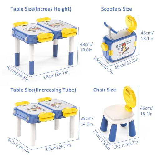 DIMENSIONE ASSEMBLATA: Tavolo per bambini con 1 set di sedie perfetto per bambini dai 2 anni in su, Dimensioni tavolo: 62 x 44 x 68 cm (25,98''L x 17,32''W x 26,77''H), Dimensioni sedia: 27 x 26 x 46cm (10.63''L x 10.24''W x 18.11''H), Dimensioni scooter: 49 x 29 x 56cm(19.29''L x 11.42''W x 22.05''H). Nessun attrezzo richiesto, montaggio semplicissimo, basta attaccare le gambe del tavolo e della sedia.