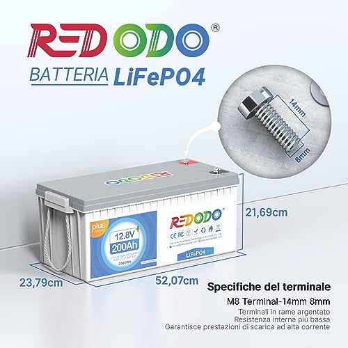 Redodo Batteria LiFePO4 al litio 12V 200Ah Plus (confezione 4), potenza massima 2560W, 4000-15000 cicli profondi, perfetta per l'accumulo solare domestico, camper, marina, scooter, ecc.