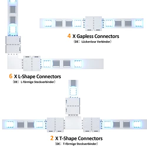 REDTRON Connettore Striscia LED,10mm RGB il connettore LED include 6x L Connettori, 4x 4pin LED Connettore, 2x Connettore a Forma di T, 2M Cavo di Estensione,4x Ponticelli Strip to Strip