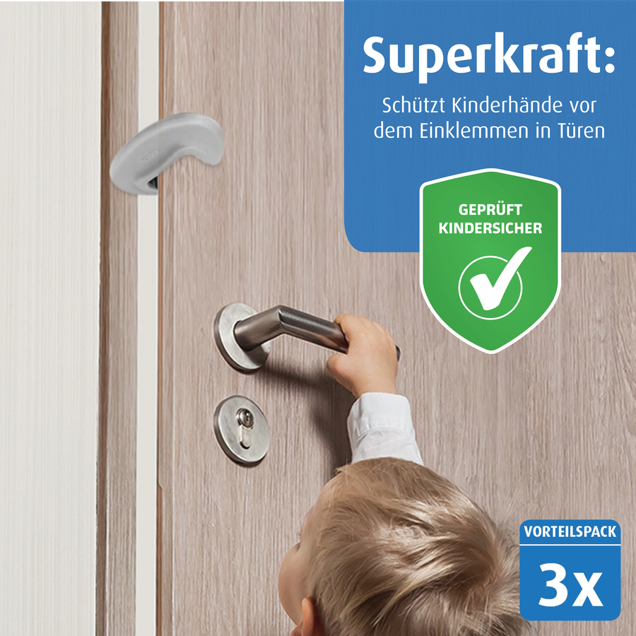 Dettagli del prodotto: Set di valori attraente Protegge le mani dei bambini dal rimanere incastrate nelle porte La speciale struttura a coste assicura una presa sicura Resistente ai morsi, forte e durevole Per porte con spessore da 30 a 45 mm Testato secondo la norma DIN EN 16654:2018 Colore: trasparente <