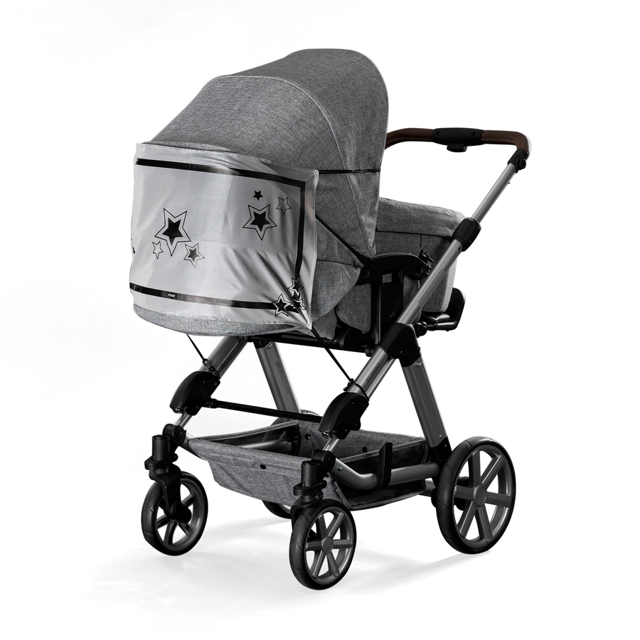 per carrozzine con navicella o passeggini rivolti all'indietro Montaggio rapido: elastici con fissaggio shake n consentono un facile fissaggio. Spazio ridotto per un facile trasporto, ad esempio nella borsa fasciatoio, ecc. Colore: grigio riflettente con stampa Dimensioni e materiale: Dimensioni (lunghezza x larghezza): 70 x 35 cm Materiale: poliestere