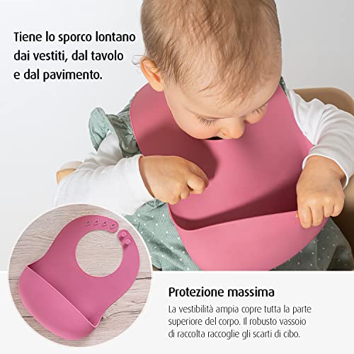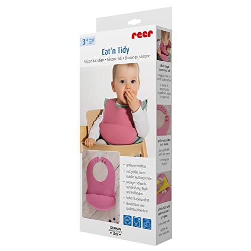 Reer Eat'n Tidy - Bavaglino in silicone per bambini, con vaschetta raccogligoccia, lavabile in lavastoviglie, colore: Rosa