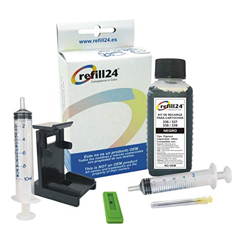 Refill24: Kit di ricarica compatibile per cartucce d'inchiostro HP 336, 337, 339, 350 nero, include clip e accessori + 100 ml inchiostro