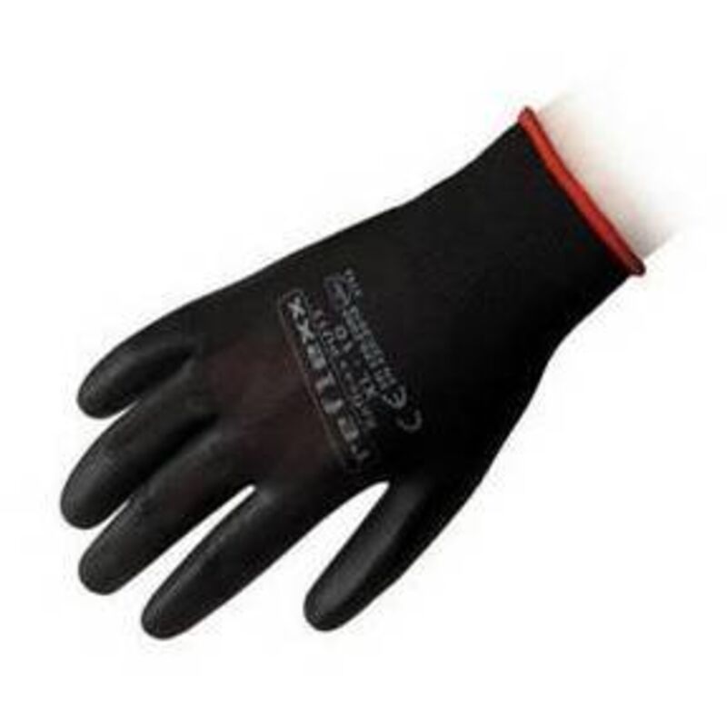 Paio guanti in poliuretano. In maglina nera sintetica a filo continuo senza cuciture e spalmati esternamente in poliuretano nero. Polsino elasticizzato, dorso e dita areate. Buona destrezza, presa e resistenza meccanica. Non idonei all'immersione. Lunghezza 24 cm. Colore: nero-nero.