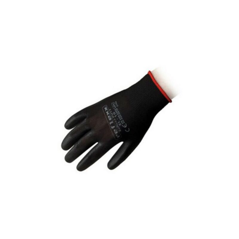 Paio guanti in poliuretano. In maglina nera sintetica a filo continuo senza cuciture e spalmati esternamente in poliuretano nero. Polsino elasticizzato, dorso e dita areate. Buona destrezza, presa e resistenza meccanica. Non idonei all'immersione. Lunghezza 24 cm. Colore: nero-nero. (DianFlex) Taglia L